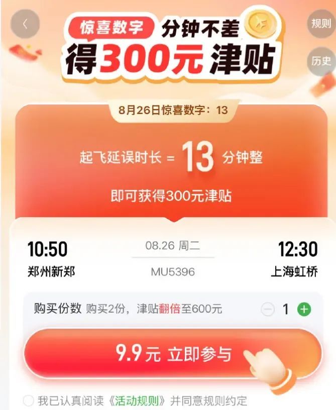 据了解,航旅纵横这款保险产品的规则设计极为特殊:每天随机设定一个“惊喜数字”,用户购买后,只有当航班起飞的延误时长恰好等于该数字(以分钟为单位,整分钟数)时,才可获赔300元津贴。例如,若当日数字为14,则航班必须正好延误14分钟,多一分钟、少一分钟均不赔付。不少消费者在实际体验后直呼“被坑”,纷纷在社交平台上分享自己的“踩雷”经历。