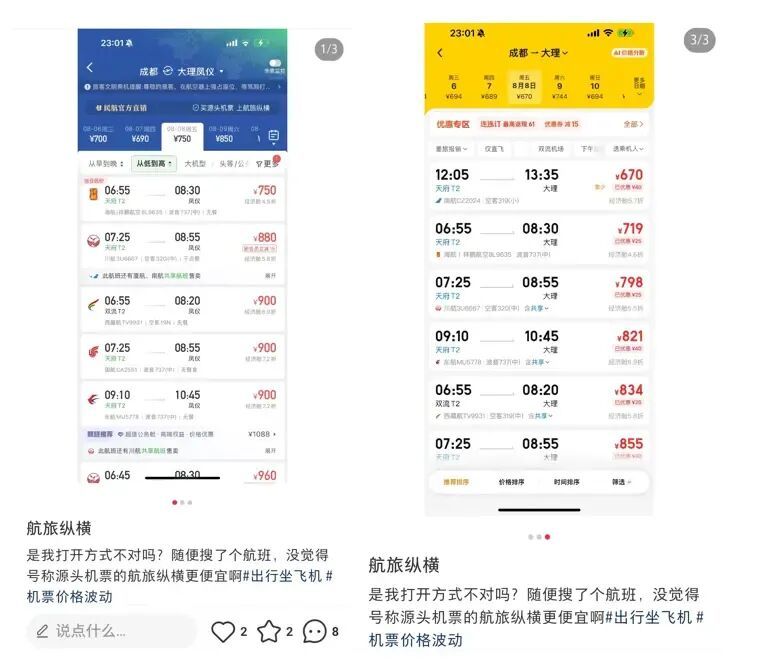 同一时间,成都到大理的机票,航旅纵横上的价格比其他平台贵了好几百。这让该网友不禁疑惑:“是我使用的方式不对吗?怎么没觉得这里的机票更便宜呢?”