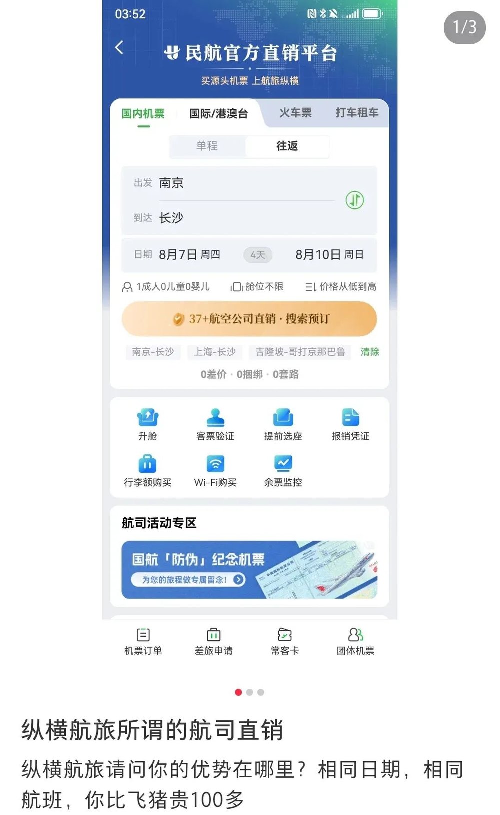 此前,7月17日,航旅纵横发布消息,宣布正式上线 “民航官方直销平台”,还打出了“0差价、0捆绑、0套路”的宣传语。