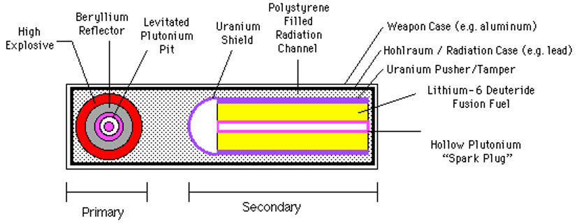 特勒-乌拉姆构型示意图,左为初级裂变装置,右为次级聚变装置。|来源:Nuclear Weapons Frequently Asked Qustions
