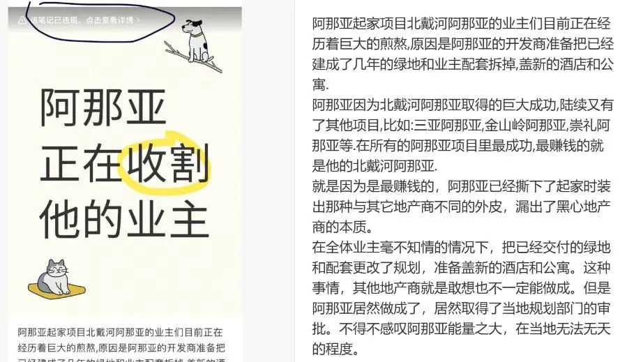 起因是开发商也就是阿那亚要把已经建成几年的绿地和业主配套拆掉,盖新的酒店和公寓,但这事儿应该是没跟业主们商量一致就擅自做主了。
