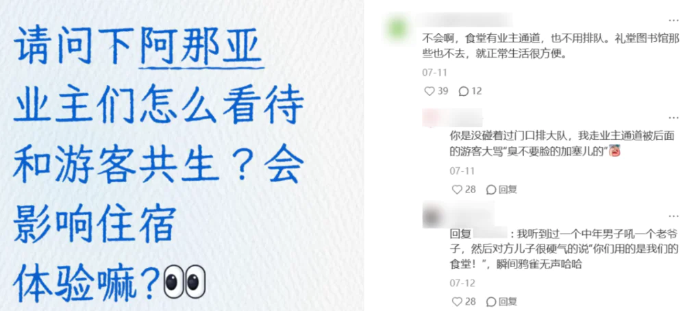 就以食堂为例,旺季时候有单独通道的业主与排大队的游客就会形成强烈对比,游客觉得有人插队,但业主则认为这是自己该有的特权。