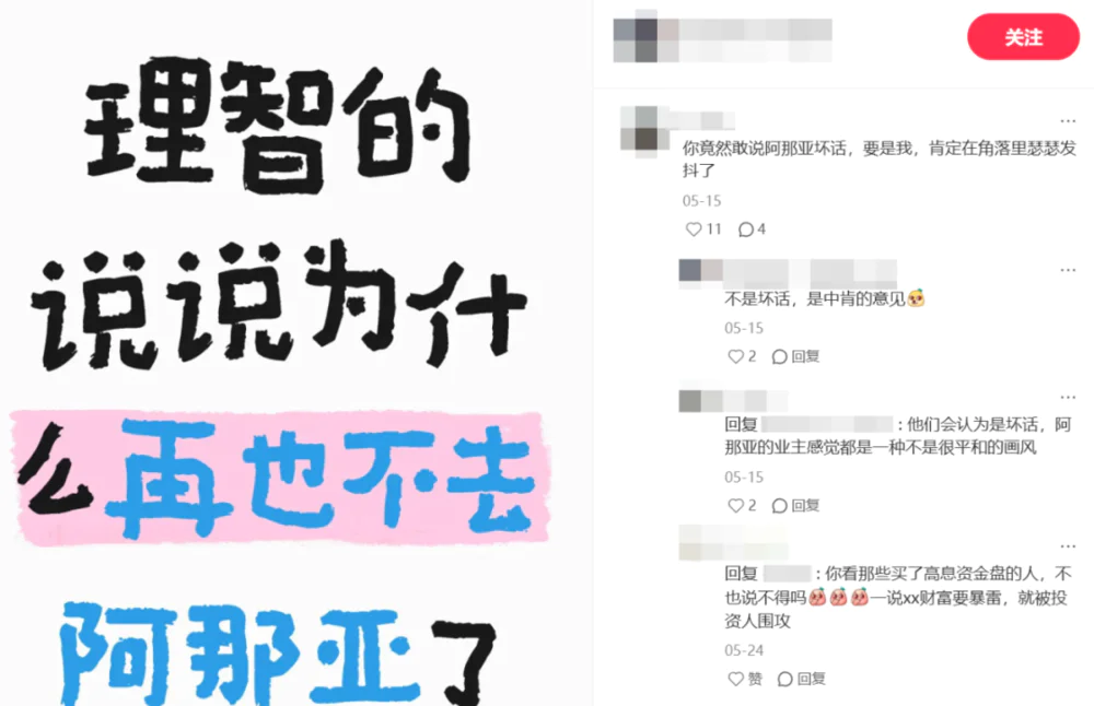 但这份不满还不能明说,一旦发泄出来分享到社媒吐槽,引来更多路人对阿那亚项目的质疑,都不用品牌方行动,就会有业主抱团来围攻,就像是与阿那亚荣辱与共的卫道士,又或是娱乐圈常见被大众声讨的饭圈文化。