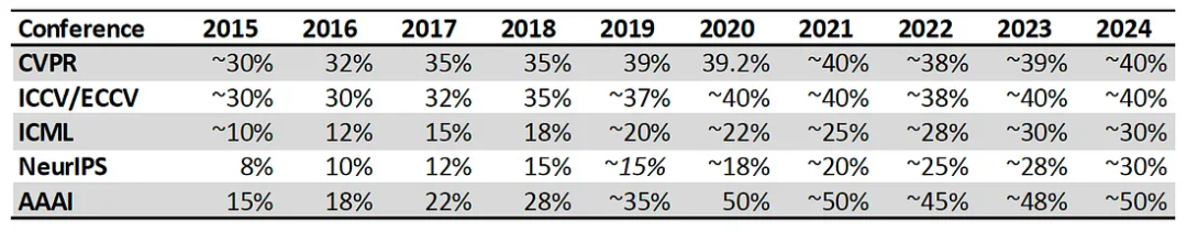 以计算机视觉顶会CVPR为例,中国作者的论文比例从2015年的约30%增长到2019-2020年时已接近40%,一举超过了美国。在NeurIPS和ICML上,这个比例也从2015年不起眼的10%左右,增长到了2024年的20-30%。