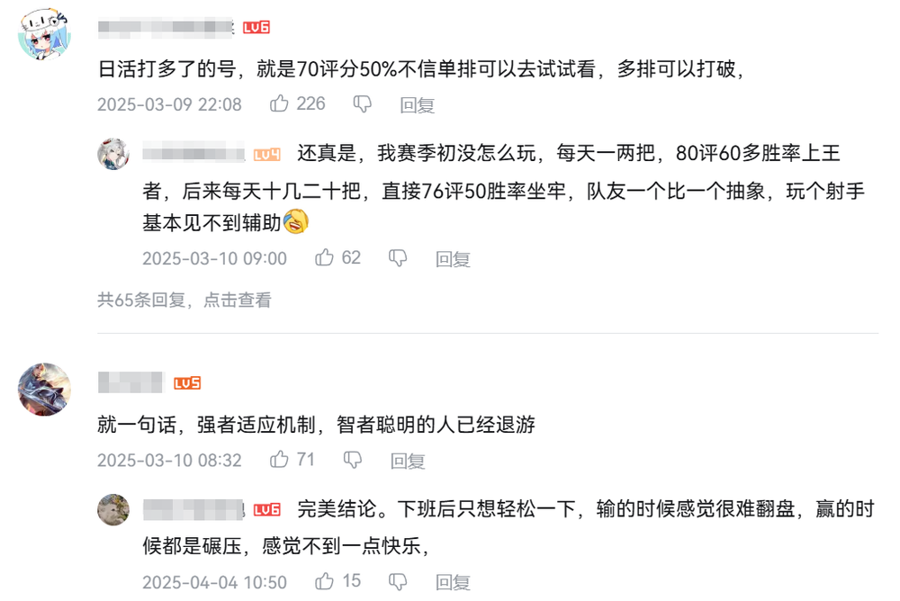 为啥网友们能一口咬定呢?一部分可能来自亲身经历,从评论里你能看到,大把大把的人在说,自己连续几把打出好的战绩之后,直接惨遭系统制裁,连输七八局,甚至连输十几局的,把把都是队友天坑,还有快打赢的大顺风局,队友莫名其妙直接挂机或者点投降,感觉队友就是奔着让你输来的。