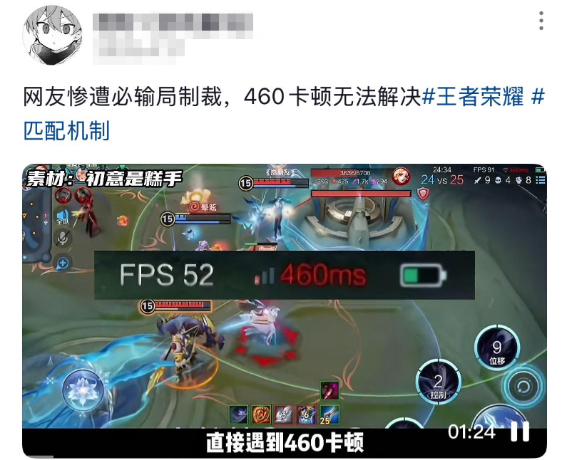 当大家用肉眼确认了,匹配系统的大手是真实存在的,那剩下就是放飞想象力了。网上各种关于《王者》的都市传说,有人说《王者》连赢之后,英雄的操作就莫名其妙变得不跟手,似乎有着细微的延迟;有人说,连胜后时不时开弹出460ms的卡顿ping值,怎么都动不了,切换WIFI或者流量都无法解决,死亡之后又恢复正常,纯纯恶心你;还有最离谱的,一些玩家相信,持续连胜后,你可能碰到所有按键都失灵的情况,让你绝对赢不了……