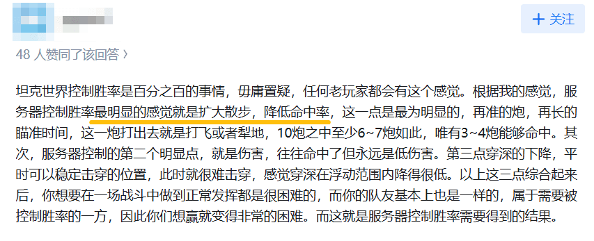 而坦克世界这游戏中,火炮的精度、穿透力、伤害,也会存在一定的随机上下浮动,玩家们又进一步怀疑,服务器还在操纵这些数值来干预胜率,如果你的技术好,连续多发都命中敌人,感觉后面炮就不准了,炮弹各种飞天遁地,车体描边,要么就老是爆出低伤,让敌人剩个血皮从你面前逃走。