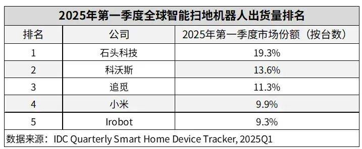 IDC数据显示,2025年第一季度全球智能扫地机器人市场出货509.6万台,同比增长11.9%。追觅科技以11.3%的份额排名第三,仅次于石头科技和科沃斯。追觅的市场优势在西南欧地区尤为突出,在法国、意大利、比利时等多个国家出货量均位居榜首。