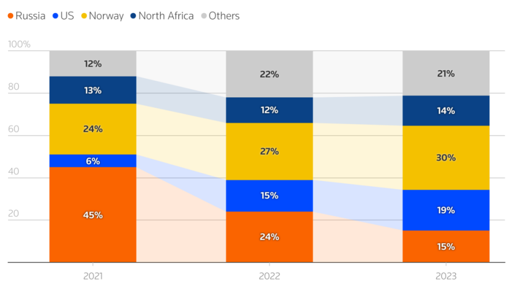 欧盟天然气进口来源的国别结构,俄乌冲突后大量份额被美国替代,而随着欧盟许诺扩大对美天然气采购金额,未来能源对美依赖将进一步加深。数据来源:欧洲委员会