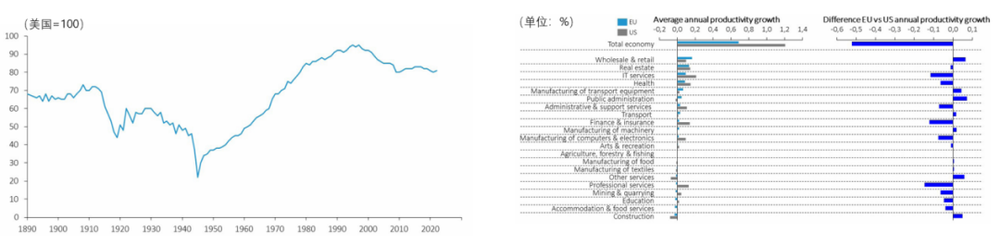 1890-2022年欧盟对美国的劳动生产率(左)和2000-2019年美国和欧盟特定行业平均年劳动生产率增速(右)。图表来源:The future of European competitiveness