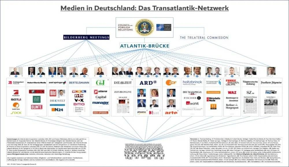 美国大西洋之桥、比德伯尔格会议、三边委员会等组织与德国主要媒体人及主流媒体间千丝万缕的联系。来源:瑞士政策研究所SPR