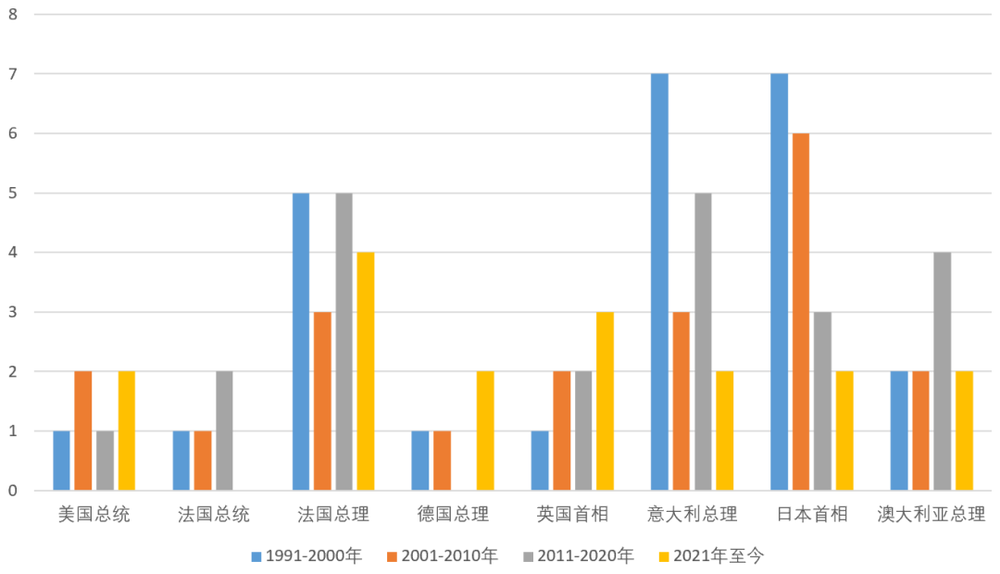 冷战后西方国家领导人换届速度,整体上近年处于加快之势。图表来源:作者自制