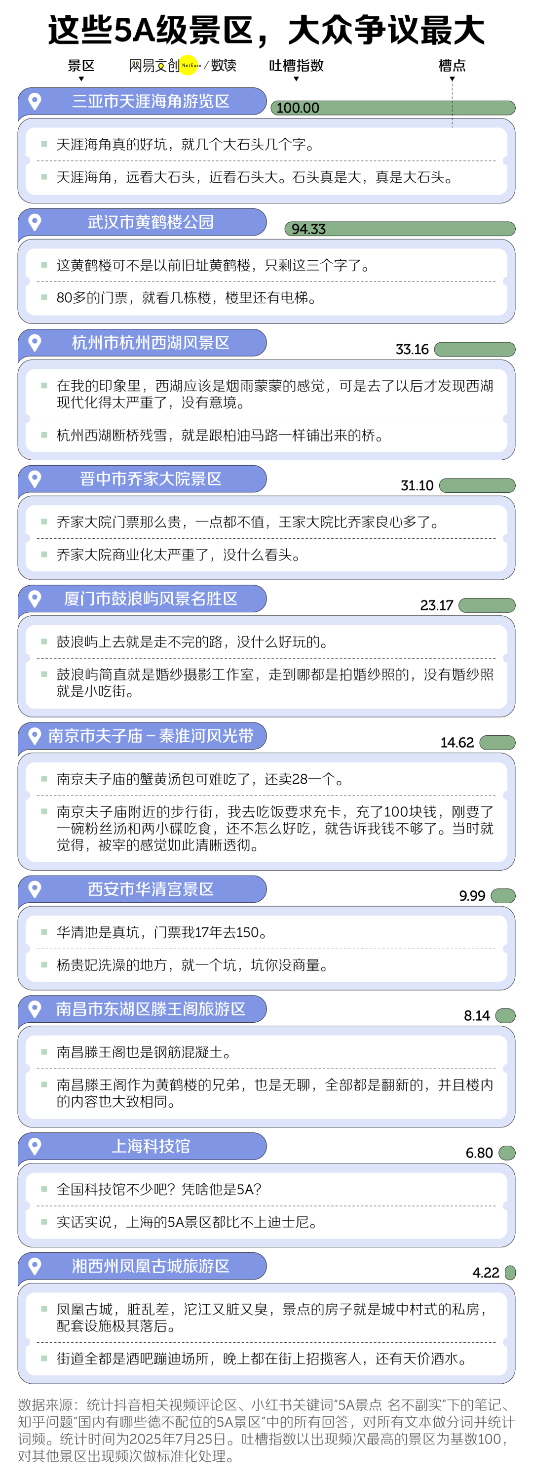我们统计了社交媒体上最饱受争议的 5A 景区,发现 2024 年新入选的天涯海角和 2007 年第一批入选的黄鹤楼两大景区,“断崖式”地承担了最猛的火力。游客们最大的哀叹,当属被欺骗了感情。