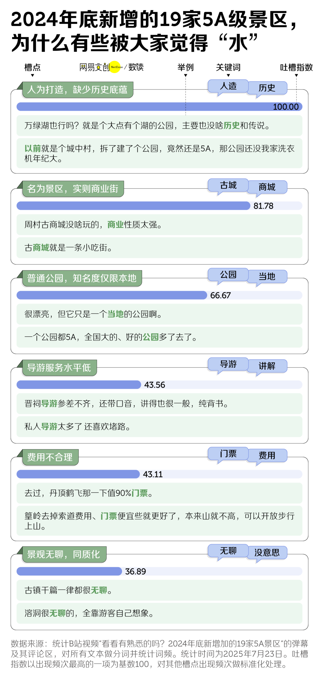 通过梳理网友们对这 19 家景区的态度,我们发现最刺激大众不满神经的,是景区的人造感。
