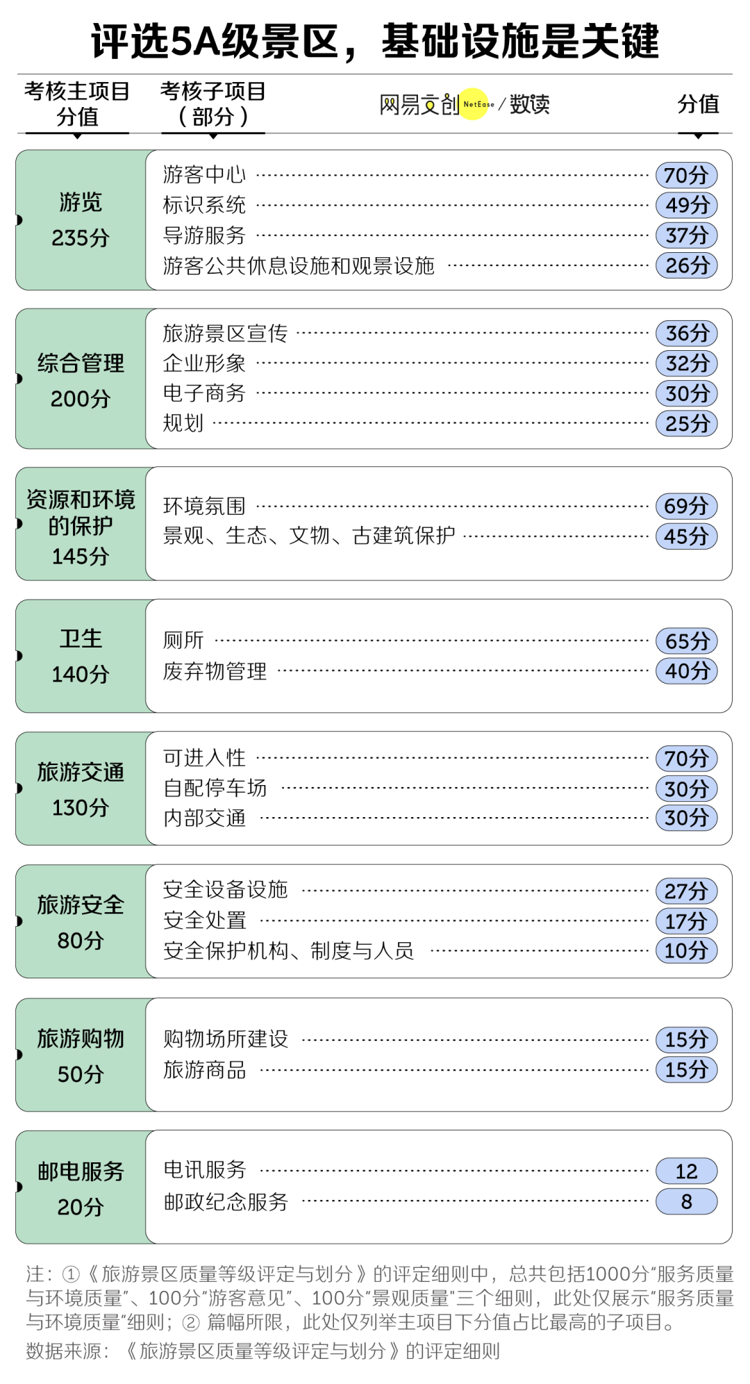 在 1000 分中,厕所干不干净、有没有游客中心、建筑美不美观,是最重头的压轴题。紧随其后的还有停车场、标识系统、导游服务等标配题目。
