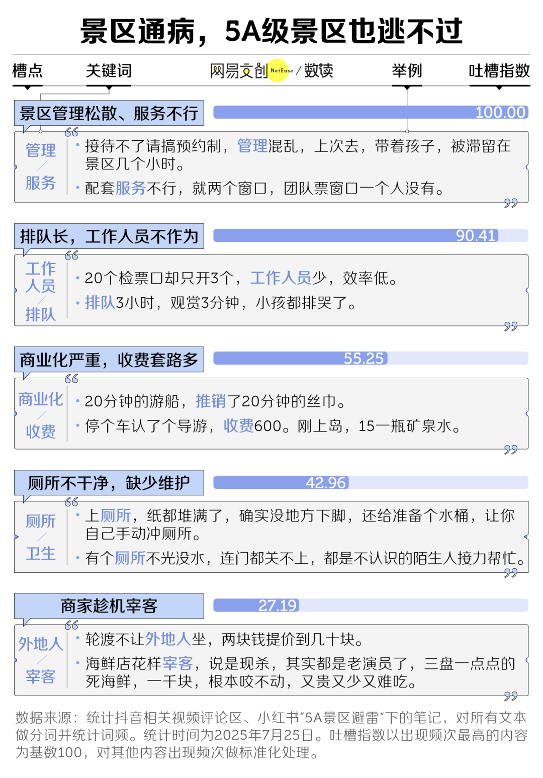 在争议最多的景区中,相比自然类景区,人文类景区可谓是槽点担当。一项来自中山大学的研究显示,来到人文类景区的游客,更在乎文化和氛围体验,而非门票、价格和服务 [2]。