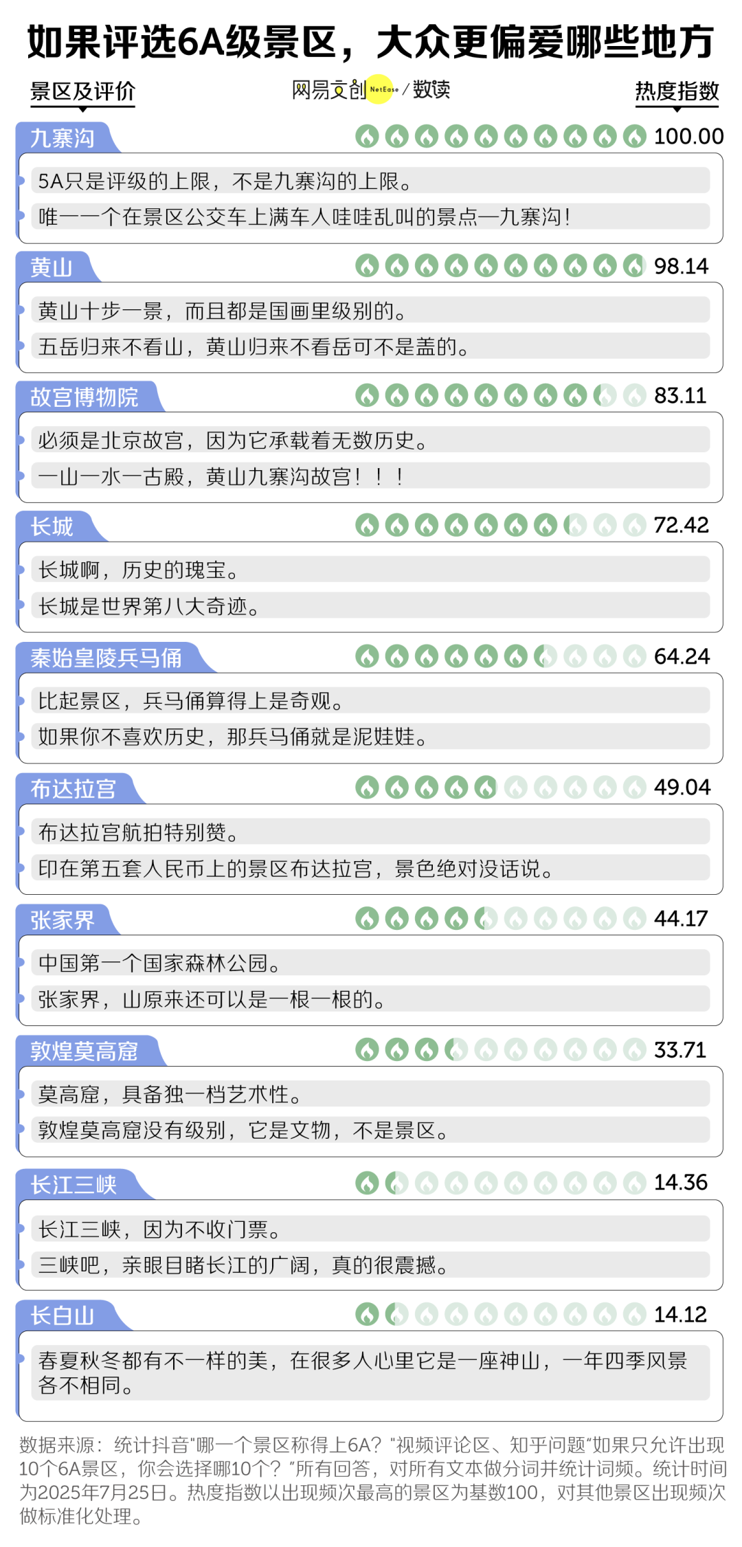 网友提名的 6A 级,人文类景区和自然类景区平分天下。“九寨归来不看水,黄山归来不看岳”的共识,最先进入人们脑海中。紧随其后的故宫、长城、兵马俑,也能靠着历史地位牢牢站稳。