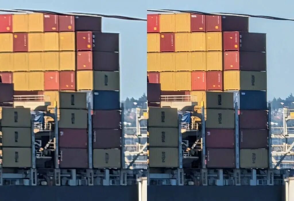 放大 100 倍拍摄,左:未开启 Pro Res Zoom;右:开启 Pro Res Zoom