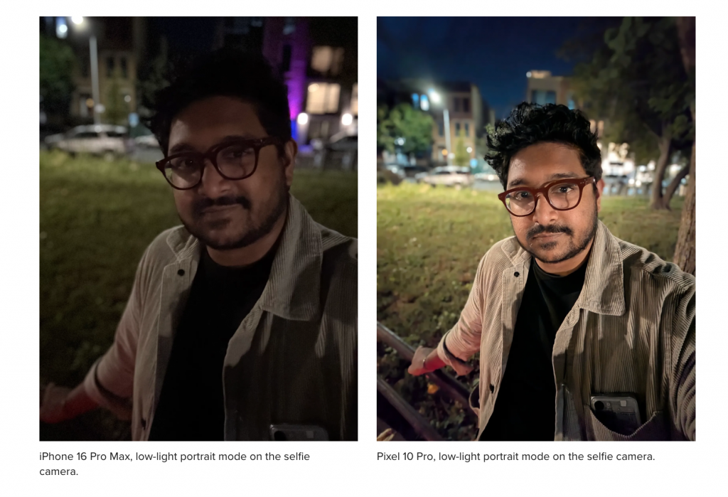 成片方面,Pixel 10 的人物肤色比较均衡,并且对头发进行了单独优化,The Verge 形容“保留了每一缕头发”,弱光环境中 Pixel 10 Pro 表现远远优于 iPhone 16 Pro。