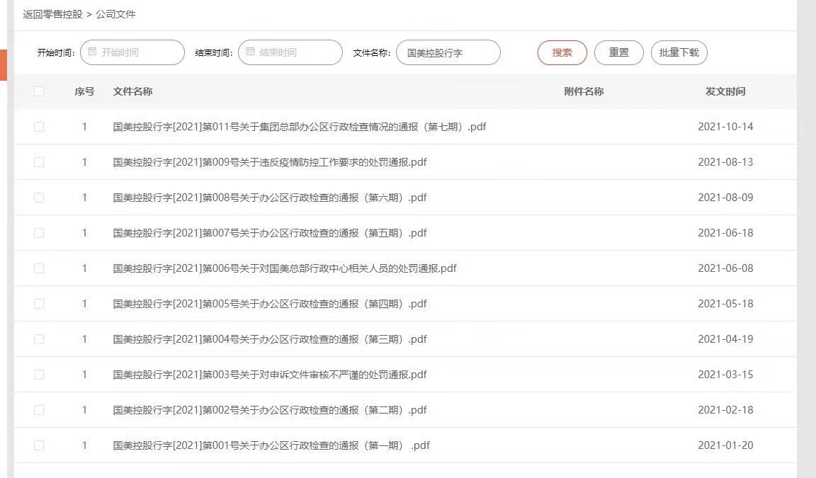 根据《最话》获得的一份国美内部资料,自2021年1月起,几乎每个月公司办公区都会开展行政检查,并进行通报。但上述国美中层说,这样前所未有的大规模处罚在以前很少发生,显示出老板对这件事情的态度。“据说行政部一开始就打算批评教育来着,结果上报到老板那里的时候,他非常生气,于是最终从重处罚了”。