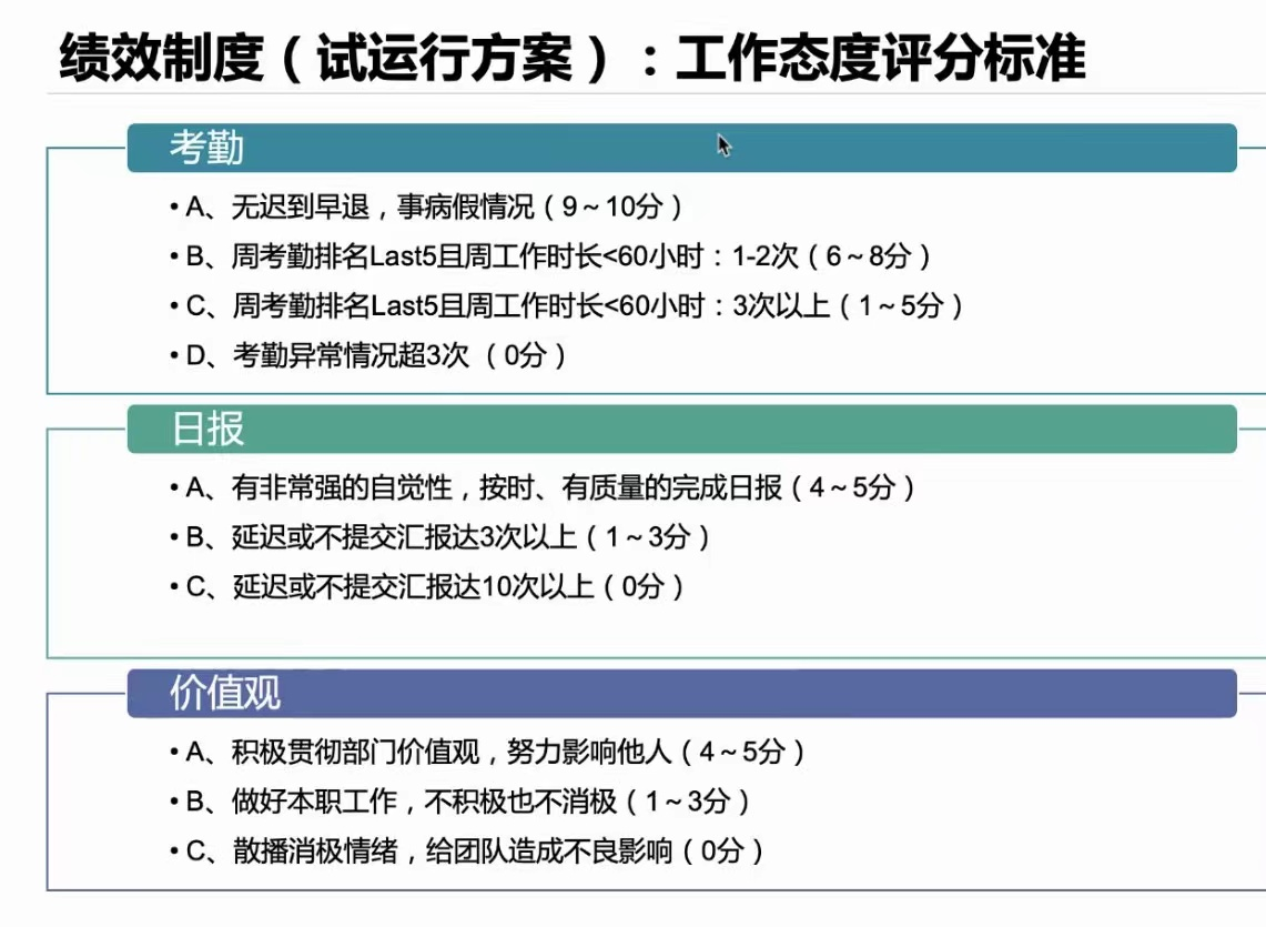 另外,在黄光裕管理幅宽之外,整个国美的管理风格也非常严。据《最话》拿到的另一份国美内部资料,该公司目前正在试运行一个绩效制度,其中包括工作态度评分标准。总分20分,16分以上才能拿到全额绩效。