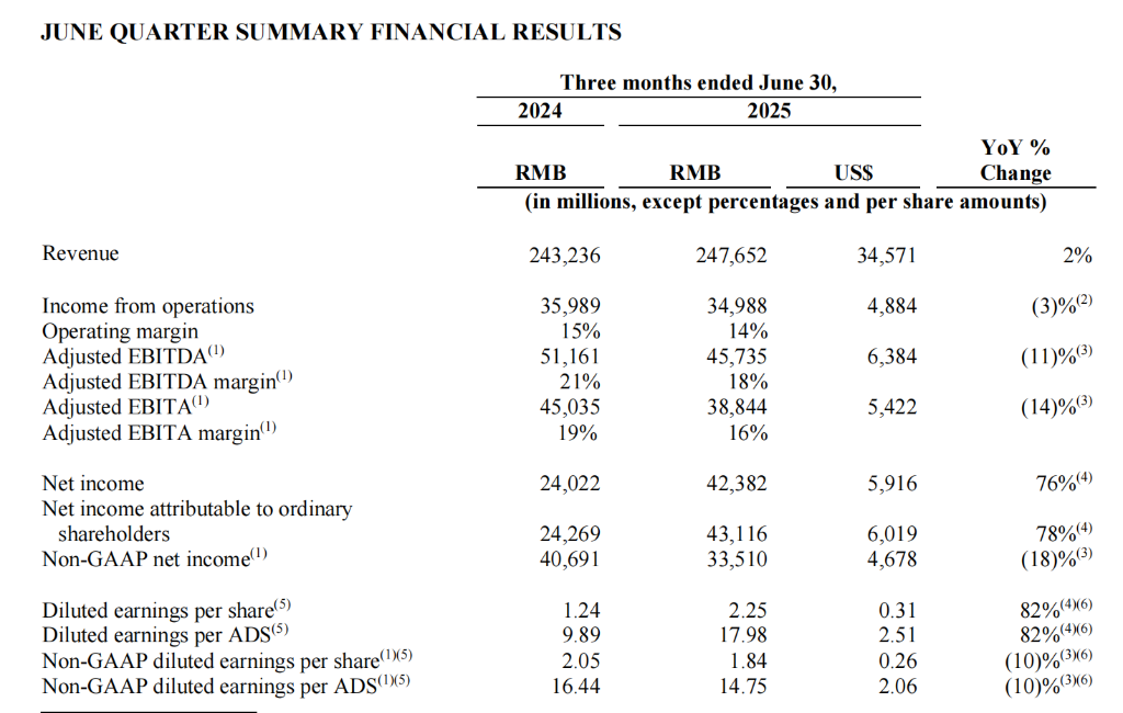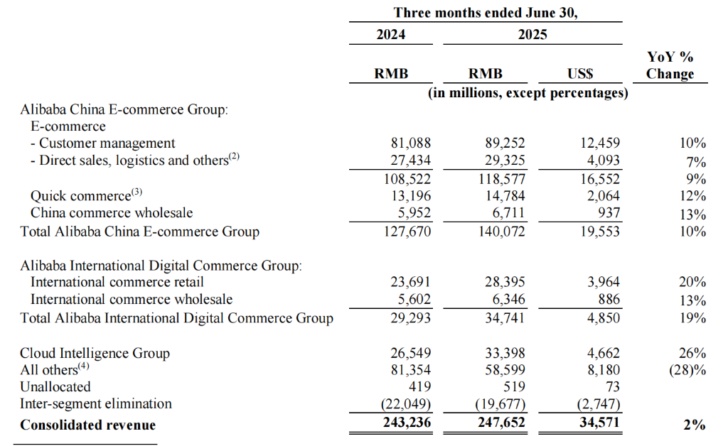 8月29日,阿里巴巴公布截至自然年2025年6月末的2026财年第一财季(下称二季度)财报: