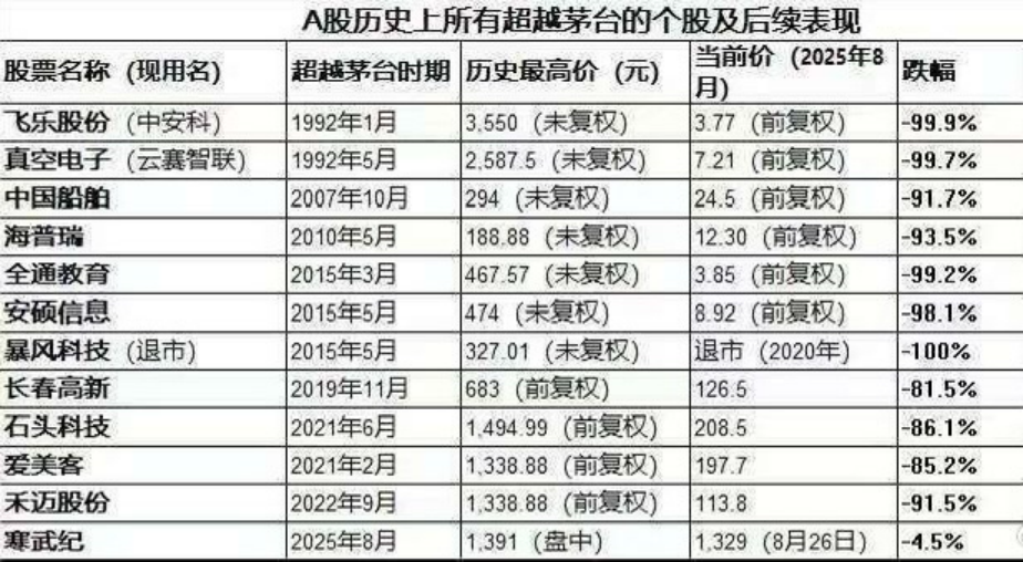 统计历史大数据发现,凡是股价超过茅台的公司,股价超过的当年就是历史最高位,往后下跌空间在70%~90%,这成为了传说中的“茅台魔咒”。请看下表: