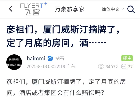 有网友在“万豪旅享家”板块发帖说:“彦祖们,厦门威斯汀摘牌了,定了月底的房间,酒店或者集团会有什么赔偿吗?”