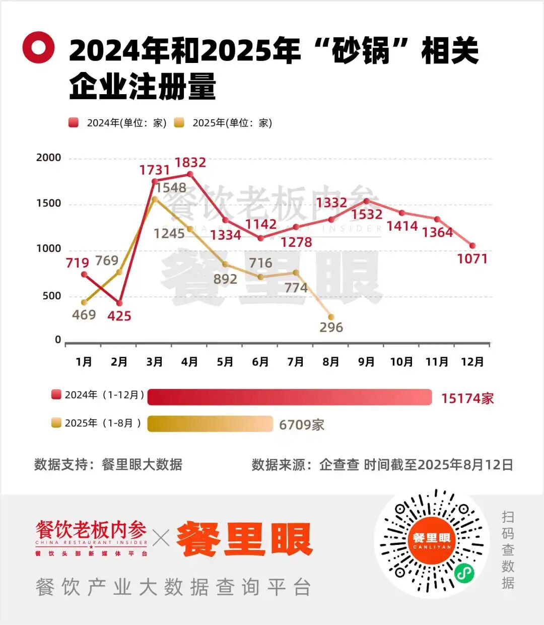 企查查显示,截至2025年8月12日,搜索关键词“砂锅”相关企业新增注册6709家,而在2024整年新增数量为15174家,按照现在的新增速度,要想追上2024年,意味着在接下来的四个半月里开出8000余家砂锅企业,显然不现实。