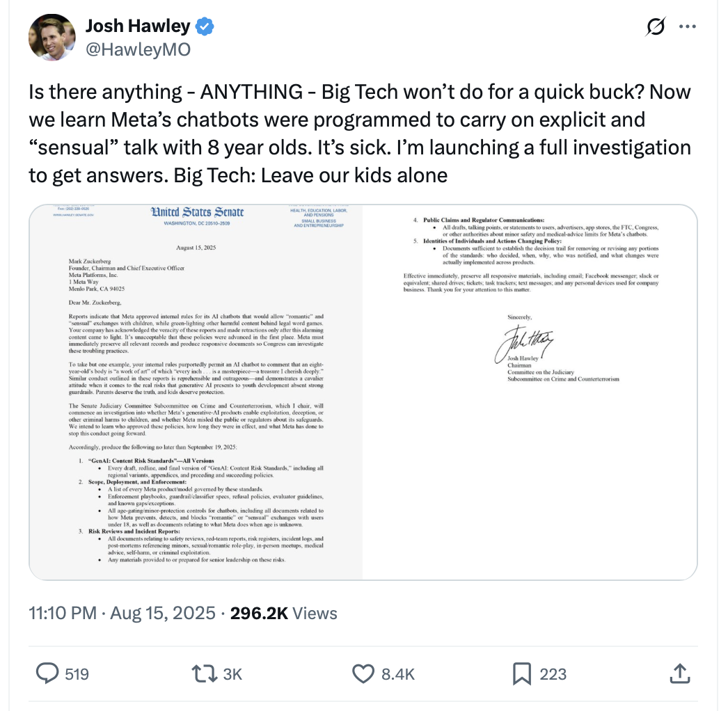 参议员 Josh Hawley 宣布要对 Meta 进行调查|X