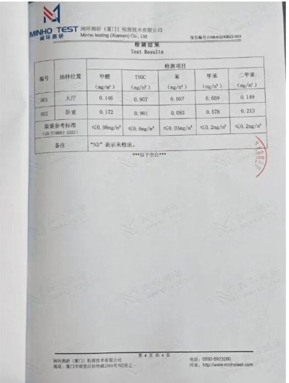而短短一周后,他就高烧住院了。检测机构出具的报告显示,房间中甲醛、TVOC、苯、甲苯、二甲苯均有不同程度的超标。