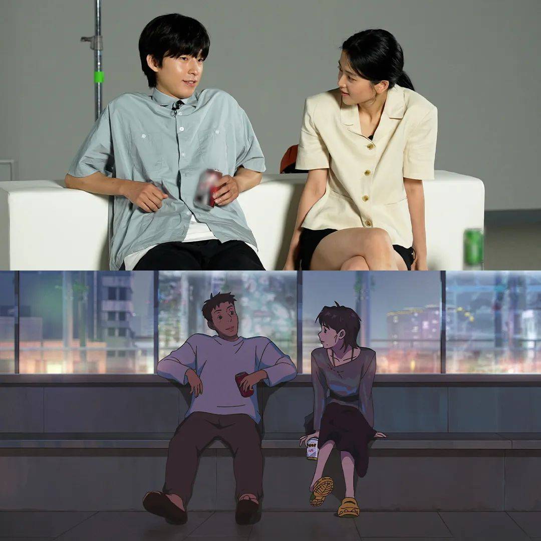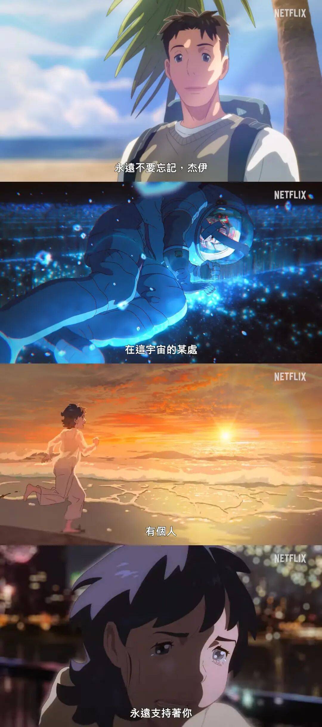 很多人在看过预告片后会产生恍惚感,不自觉地想到新海诚。男女主在宇宙中分离思念彼此的设定让人联想到《星之声》,光影氛围也有一种新海诚作品的味道。但是真正看过正片的人会发现,这部作品有着独属于自己的特色。