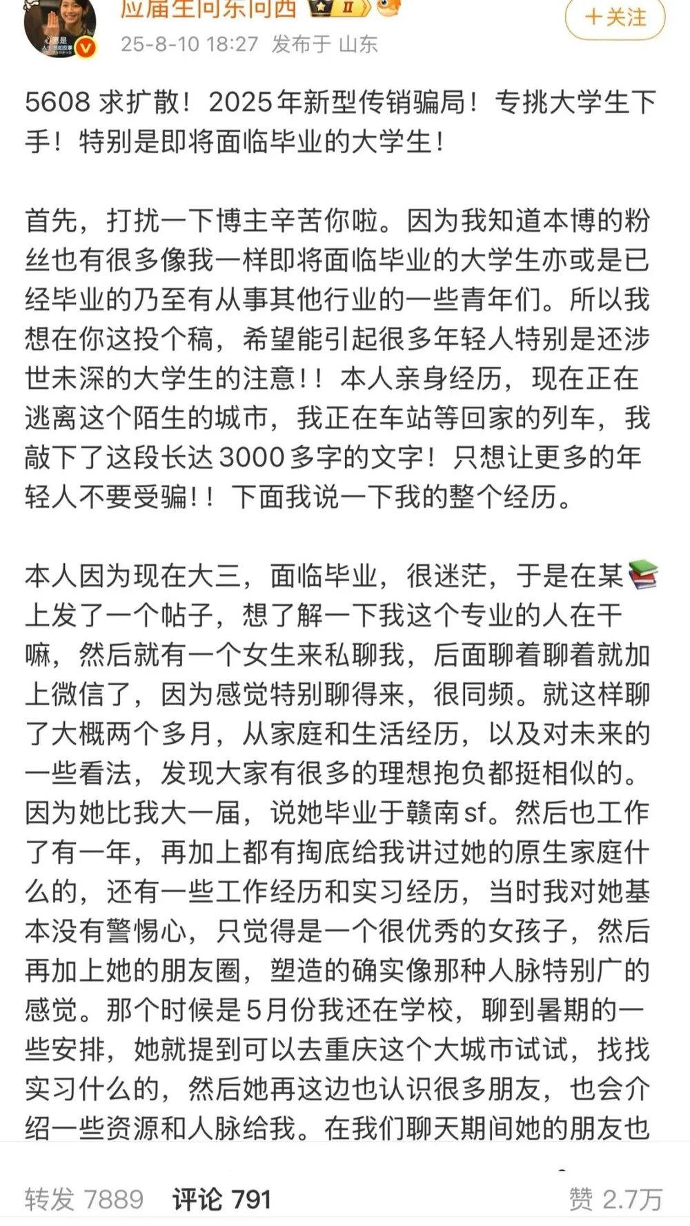 她只是在社交平台上表达了自己对于毕业的迷茫和焦虑,就有一个自称有相似经历的人联系了她,两人一时间十分投缘,很快就变成了要好的网友。