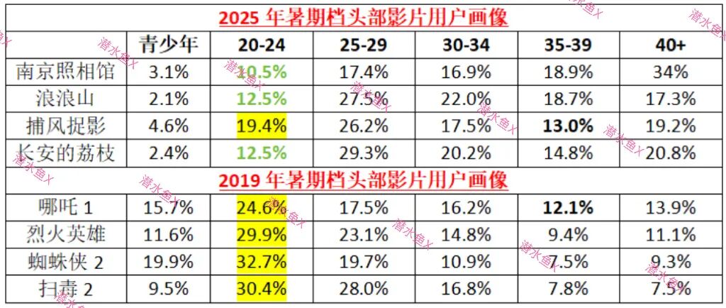 单看这组数据很难发现问题,但如果和2019年暑期做个对比就会发现,当年暑期的观影主力,是20到29岁的人群,其中大学生(20~24岁)群体占比最高——相比于今年,主力观影人群的年纪正好小了5岁左右。换言之,今年暑期最爱看电影的,和当年其实是一拨观众,只不过他们的年纪增长了。而这也说明,今年并没有更多的新鲜力量涌入电影市场,当年20岁以下的青少年占比超过了10%,今年这部分最年轻的人占比却在5%。