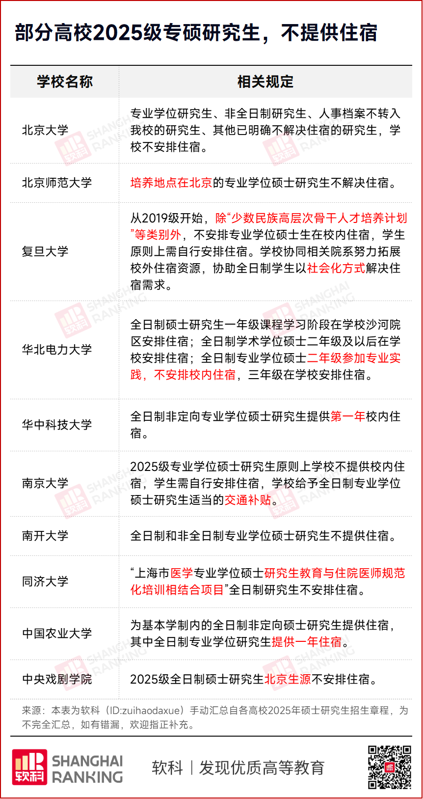 近两年,多所学校的研究生招生简章显示,学校将不再为全日制专硕提供宿舍。复旦大学从2019级学生开始便不再安排专硕学生校内住宿,北京大学、南开大学、南京大学等高校也在招生简章中明确专业学位研究生不予安排住宿,这部分学生只能自行在校外租房。