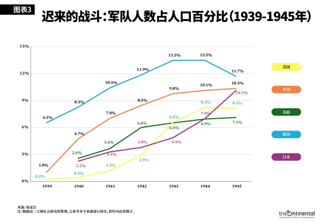 表3:迟来的战斗:军队人数占总人口的百分比(1939年至1945年)