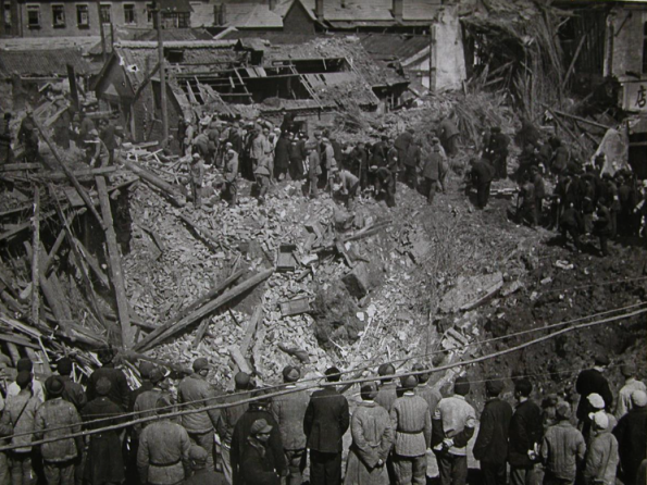 从1950年8月起,侵朝美国空军不断侵入我国东北领空,疯狂轰炸边境城镇和乡村。这是丹东市被轰炸后的情景。 抗美援朝纪念馆资料图
