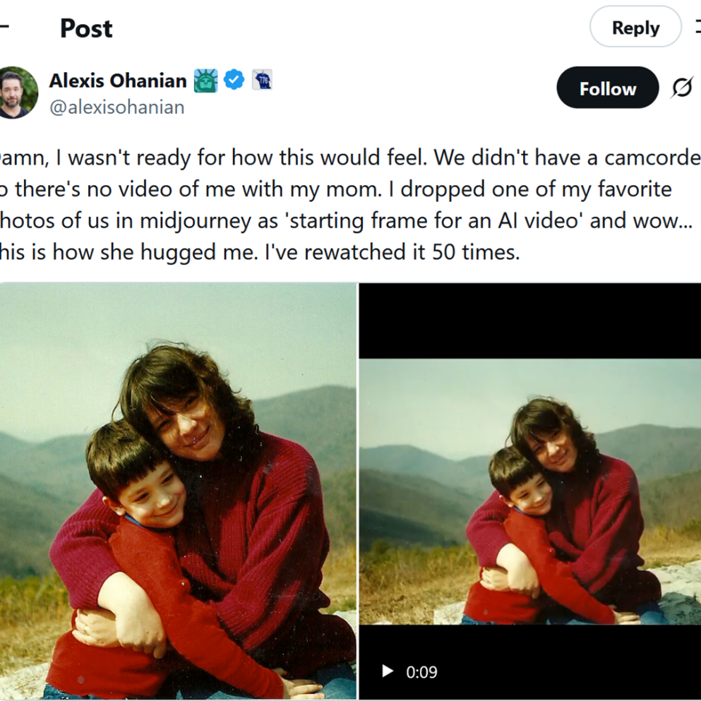 2025年6月18日,人工智能图像生成公司Midjourney发布了一个新工具,允许用户以自己的图像作为模板创建短视频。几天后,Reddit联合创始人,已逾不惑之年的Alexis Ohanian在社交平台推特上发布了自己为已故母亲Anke创作的视频:影像中,母亲将年幼的Alexis抱在怀中,笑着哄他入睡。