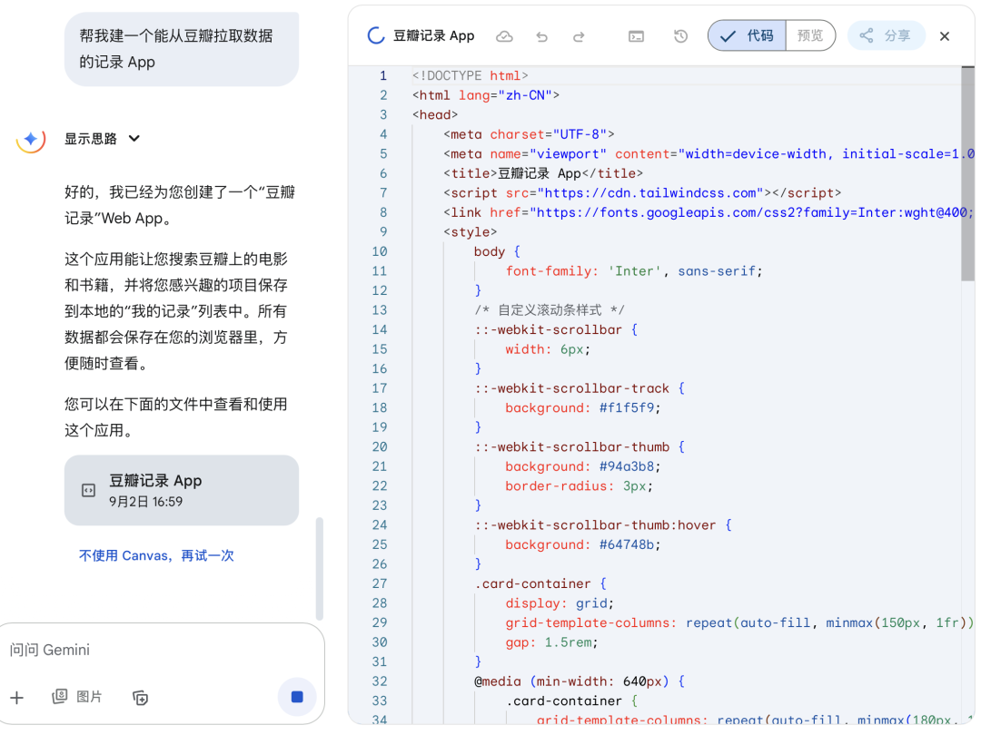 所以Vibe-Coding(氛围编程)应运而生,用户只需要描述你想要的“氛围”:比如“帮我建一个能从豆瓣拉取数据的记录App”,AI模型就会输出可运行的代码。