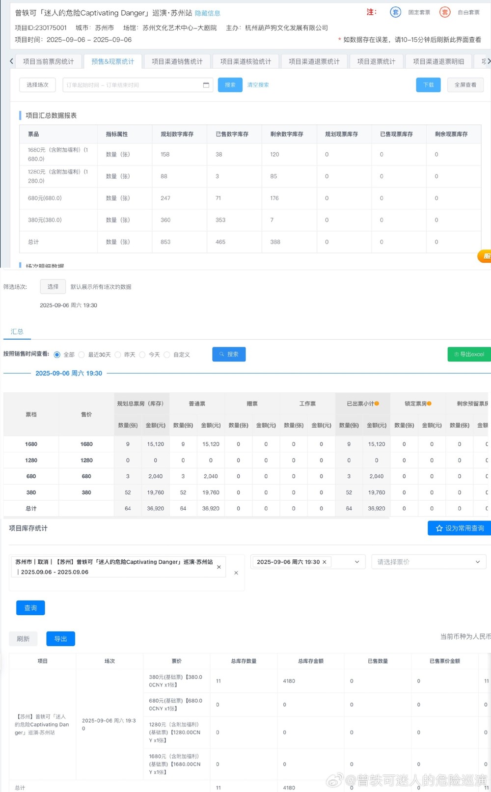 曾轶可演出主办方在网络直接公开售票数据。图源:微博