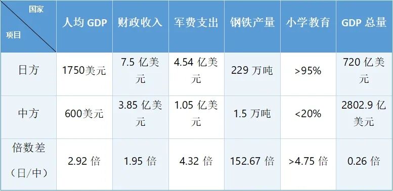 与甲午战争时的晚清比起来,历经37年后,民国国力和日方国力的差距,在国民识字率与钢铁产量方面略有缩小,军费支出的差距也略为缩小;但中方军费的70%消耗于军阀内战,且财政收入和人均GDP的差距则更加扩大。