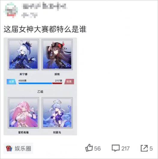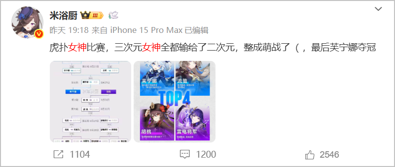 随着米哈游角色在四强团建,女神大赛的声量相比刚开赛时要小了许多,它开始变得像其他萌战一样,变成了对角色的应援。