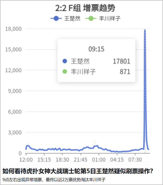 根据票数数据,更多有组织的投票的一开展,同时很多参与投票的用户,开始根据异常的曲线变化,质疑比赛的公平性。