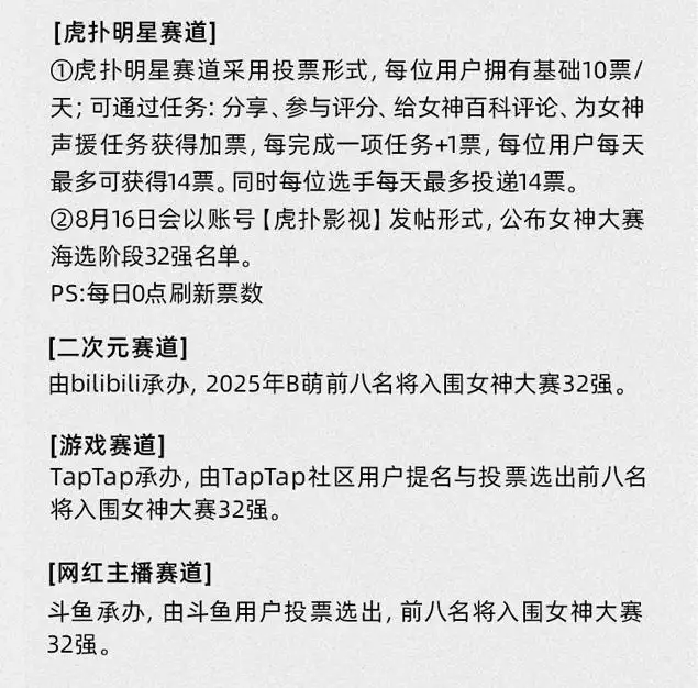 每个平台都有各自的票选活动,票选出的前8名,以平台分赛道。虎扑自家是明星赛道,B站推举B萌选手进入二次元赛道,斗鱼票选女主播进入网红赛道,TapTap票选出角色进入游戏赛道,最后共同组成32强。