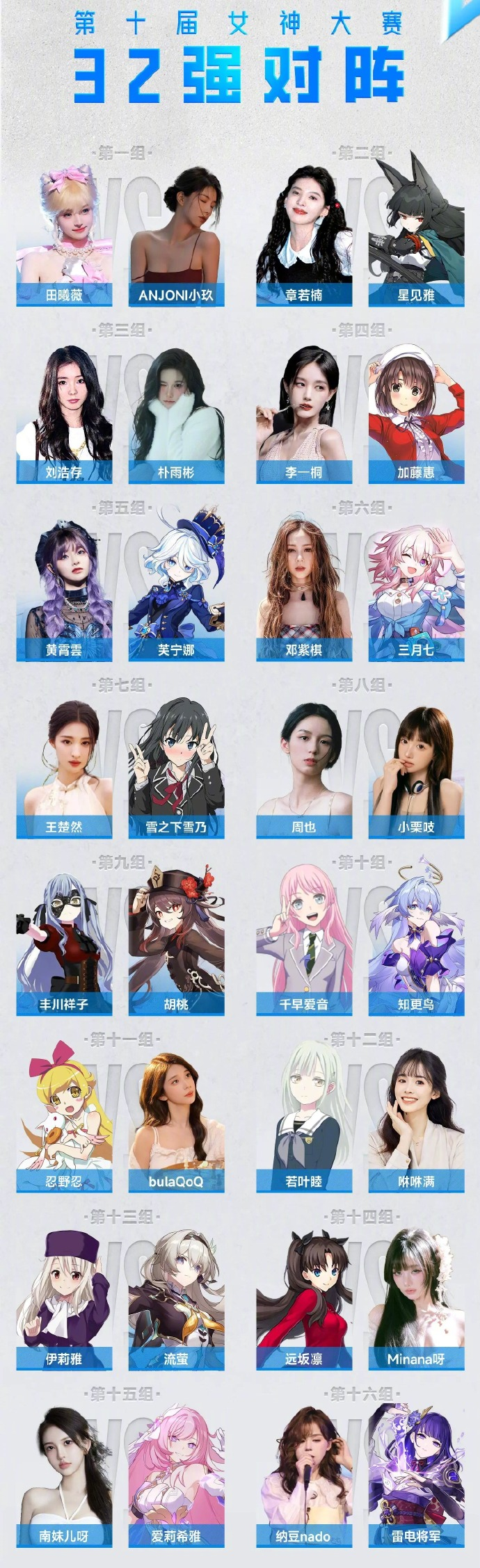 今年女神大赛正式打响名号就是从这张32强的海报开始。海报上个个都是大能,你能看到丰川祥子vs胡桃,章若楠vs星见雅,李一桐vs加藤惠……