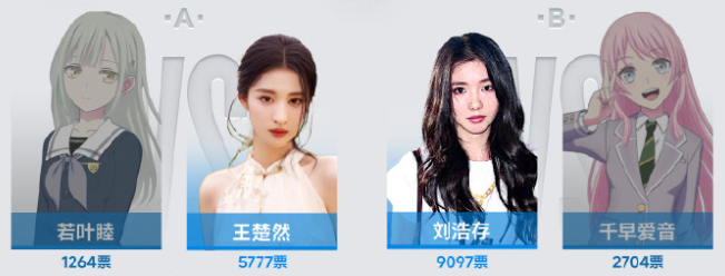 在1:1的赛池中,B萌选出的动画角色仍是输多赢少。在印象里,本该大杀特杀的木柜子乐队被王楚然、刘浩存分别击败。