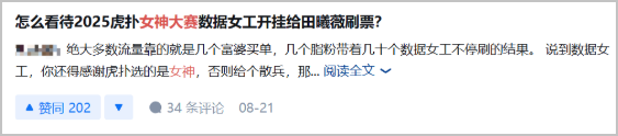 这就是为什么这一届虎扑女神大赛争议不断,却很难让人真正买账。天然把不同话语体系的人丢进了同一个计票器,将“娱乐化投票”与“应援化投票”放在一张桌子上博弈……矛盾藏在规则里,冲突本身在所难免。