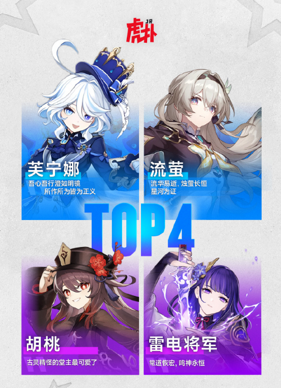 虎扑女神最后的四强:芙宁娜、流萤、胡桃、雷电将军。