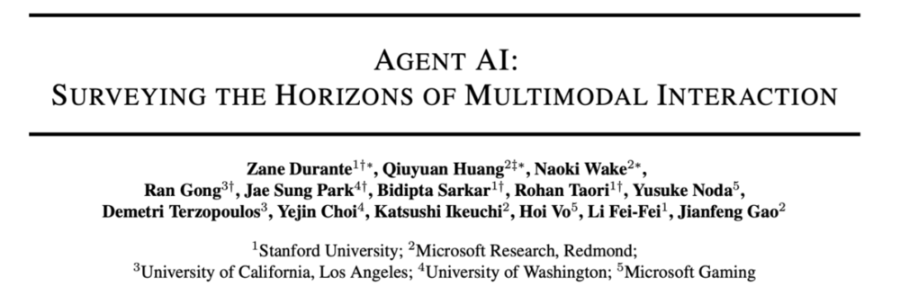 这篇长达80页的综述名为《Agent AI: Surveying the Horizons of Multimodal Interaction》,由李飞飞等14位来自斯坦福大学和微软的专家联合撰写。