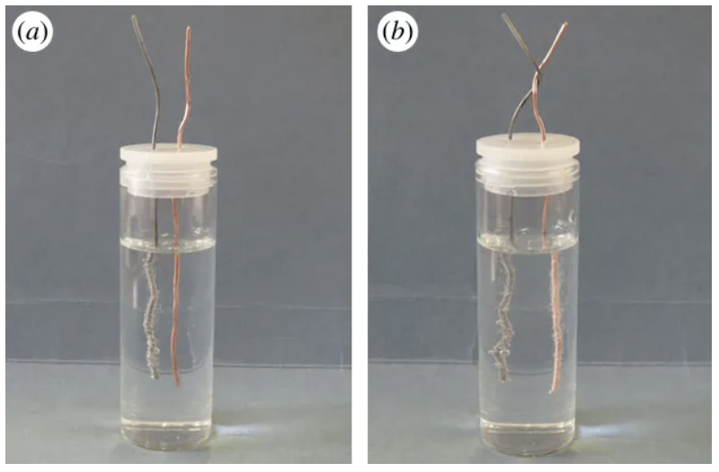 几乎每个成功复现的实验都会引出一些开放性的问题,人们可以通过进一步实验探究上述问题。事实上,这正是实验科学的本质所在。因此,在复刻前文提到的西氏的精妙实验后,我自然而然地产生了一些问题:这种现象是如何发生的?为什么该置换反应不会在银覆盖住铜表面后就此停止?为何后续生成的银还能在已有的银层上继续生长?西尔维斯特认为,当生成的银沉积在铜(或锌)表面时,这两种金属相互接触并在硝酸盐溶液的环境下形成伏打电堆;电流因此流向银沉积物的远端,并在那里进一步还原银(以当代术语表述,即电子流向银树远端,在此与附近溶液中的银离子相遇,由此产生并沉积更多中性银)。这一解释具有相当的合理性,但验证其正确性会极具意义。此外,从理论上研究为何脱离铜的电子会穿过现有银树枝的末端,并同远端银离子发生作用,而非与毗邻铜表面的银离子结合,如此则导致整个铜表面迅速为银覆盖,从而停止伏打作用,这同样值得探讨。